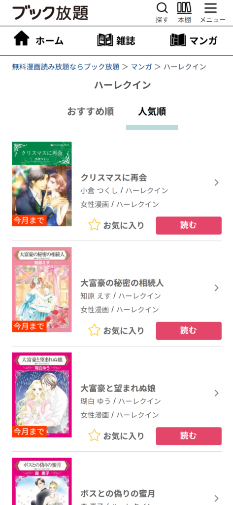 ※ハーレクインコミックが読み放題で楽しめるブック放題はこちらから