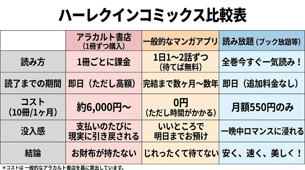 読み放題サービスなら、数多くのハーレクインコミックスがラインナップされており、月額550円だけで追加料金を気にせず、心ゆくまでロマンスの世界に浸ることができます。
