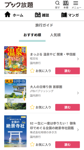 読み放題サービスの会員になる事で、全国・海外の主要エリアはもちろん、神社・仏閣に特化したガイド、道の駅・ローカルグルメ特集、テーマ別・目的別の切り口ガイドなど、「少しコアな視点」の旅行ガイドを多数読む、そして持ち歩くことができます。